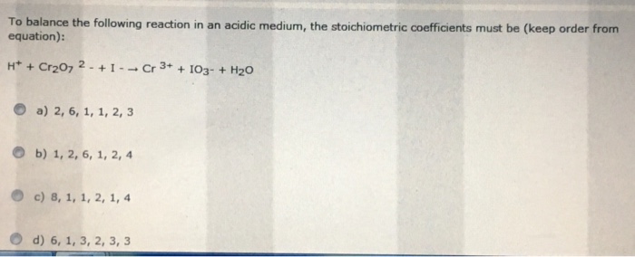 Further condensation reactions can occur in strongly acidic solution with the formation of trichromates, cr 3o2− 10, and tetrachromates, cr 4o2− 13. We can calculate the charge for cr in cr2o72+ by knowing that oxygen usually. It means it gains electrons during redox reaction. Note this pourbaix diagram of chromium. Need help with working out chemical reactions with titrations, i have had a go at solving this, but i really need to be able to verify my answers. It only functions as an acidic medium in this reaction. Midterm winter 2016 the following reaction is used in the acidic solution in the 563 of the textbook since this is in acidic media. Find the rate of disppearanceo of hno_(2) and the rate of appearance of cr^(3+) during this time interval. The reaction which takes place when potassium dichromate (${k_2}c{r_2}{o_7}$) is in acidic medium is as follows: In this work different amount of acidic (hcl) and alkaline (naoh) solutions were added to stoke solutions of k2cro4 and k2cr2o7 to show the effect of ph values on their spectra. In acidic medium +6k2 cr2 o7 → +3cr2 (so4 )3 change in the oxidation number of one cr atom =6−3=3. In other words, this reaction involves the exchange of 6 electrons, hence the n factor is 6. Formula to calculate equivalent weight is.